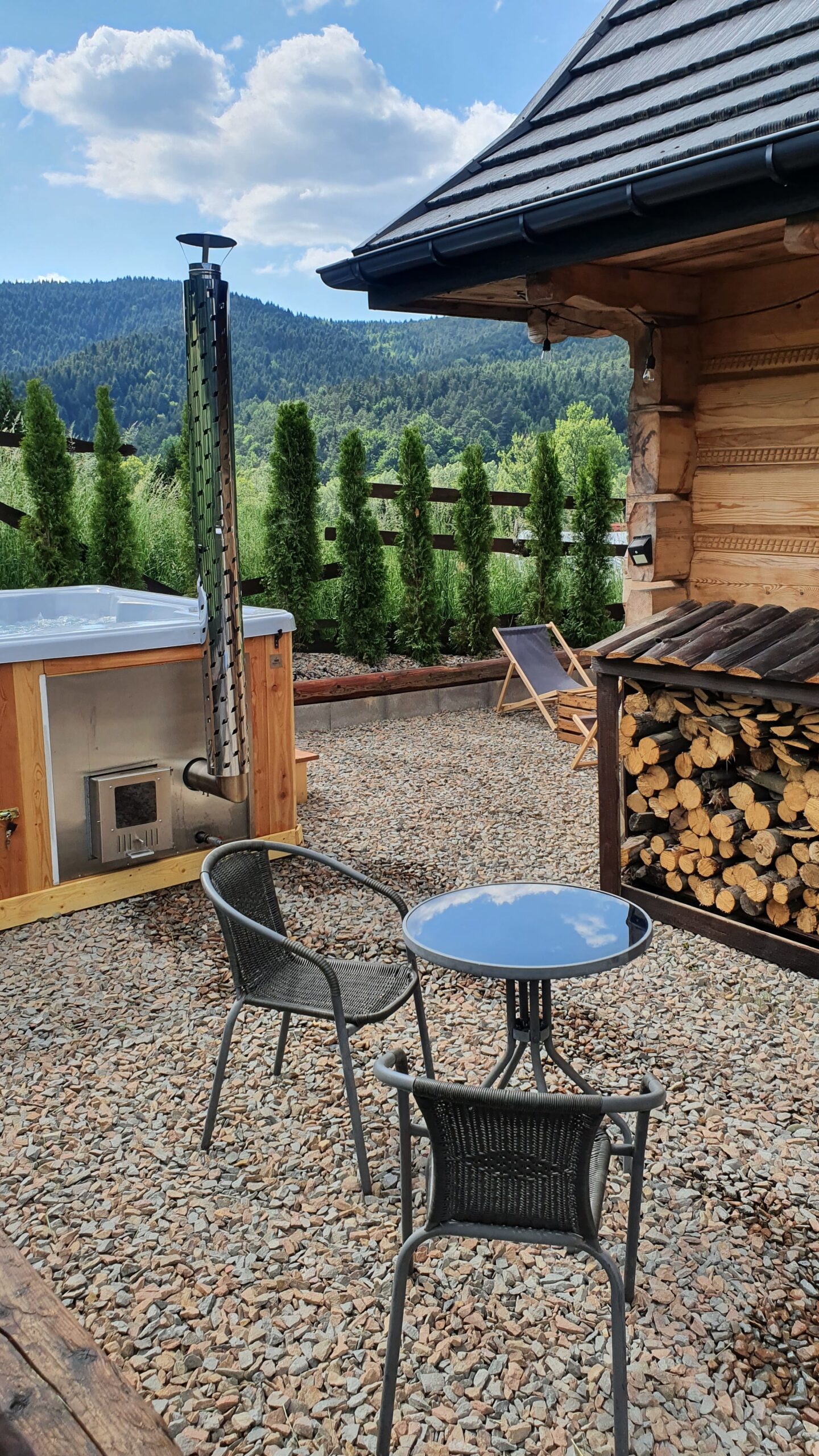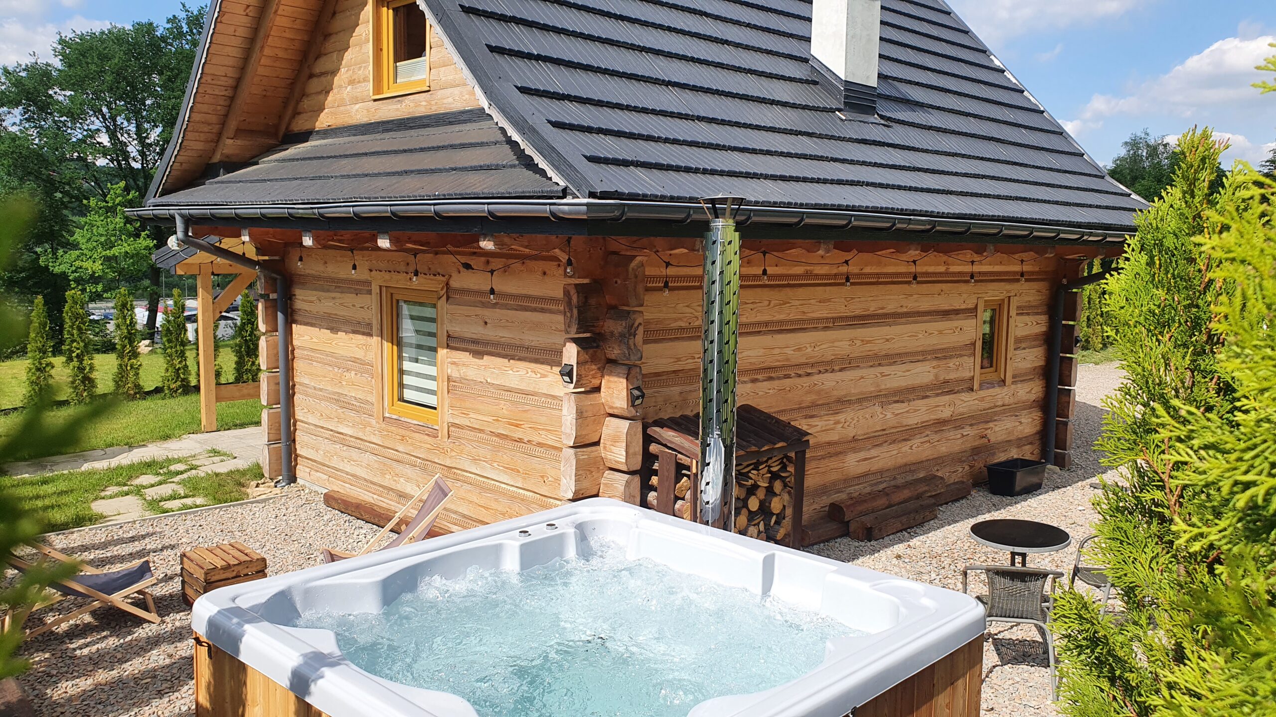 Miejsce do grilla, leżaczki, jacuzzi to wszystko w otoczeniu lasów z widokiem na Górny Jaz na Zarabiu tylko 30 metrów od kolejki linowej prowadzącej na górę Chełm.